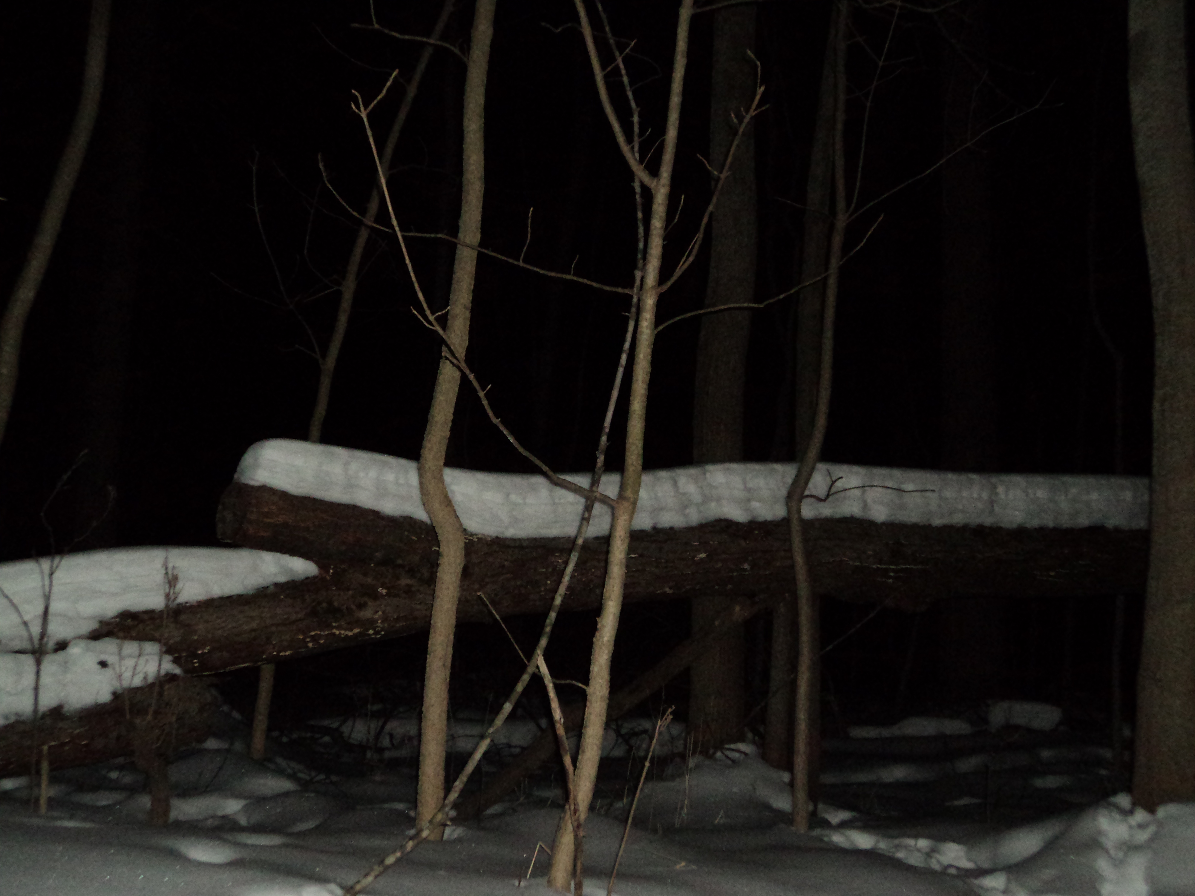 This is not the bright snow of the day, which has its own pleasures. Nor is it like a dim day, where the sky is grayish, and the snow feels that way too, and they blur together more. There is a sharpness to a clear night under a full moon. The trees lose the color they have during the day – beyond the nearby, they become shadows and dimness. There is little to see in distance in forest, or in air around you, or in sky. Amidst that, something sticks out: the snow may be dim, but it is starkly white. The shadows cast by the moon cut boldly across this. So the observable world becomes narrowed in focus – the shadows, and the dim white snow.