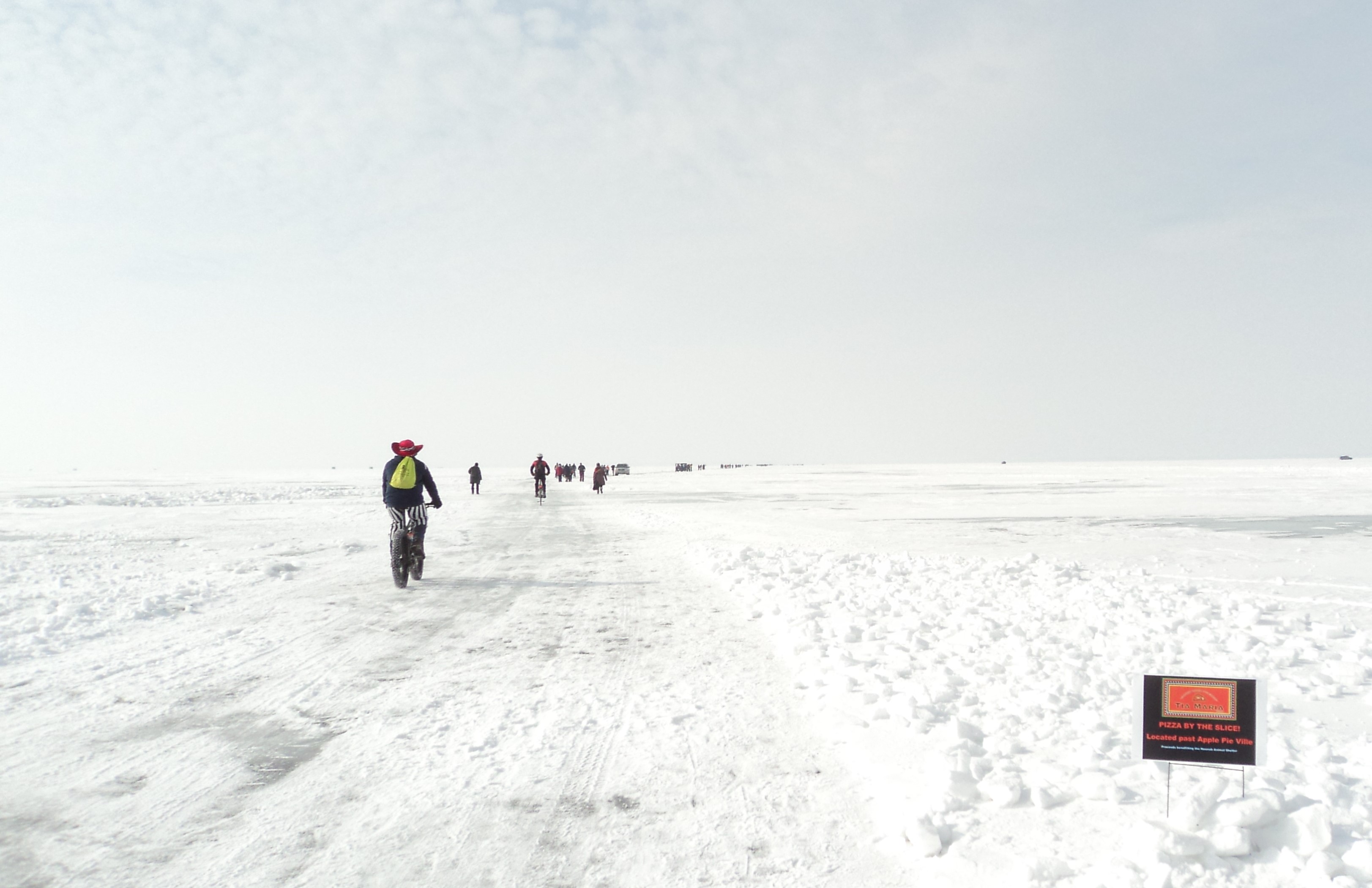 As my final image to represent this year’s walk, I want to recapture that combination of walkers and bikers, wild nature and community conversation, of so many different contributions from locals in the area, that makes this event special. This year, ads on the side of the road – which reminded me of Wall Drug πŸ˜‰ – kept reminding us that pizza was ahead. (I love the directions: ‘after Apple Pie Ville.’ Yep, when you’re walking straight on the only road you see on the ice, that’s direction enough!) The walk saw a steady flow of walkers, occasionally visited by trucks, snowmobiles, bikers (and one plane). This is Winter, this is Wisconsin, and this is how we like it! Now, its your turn to get out and enjoy winter, other Wisconsin communities…