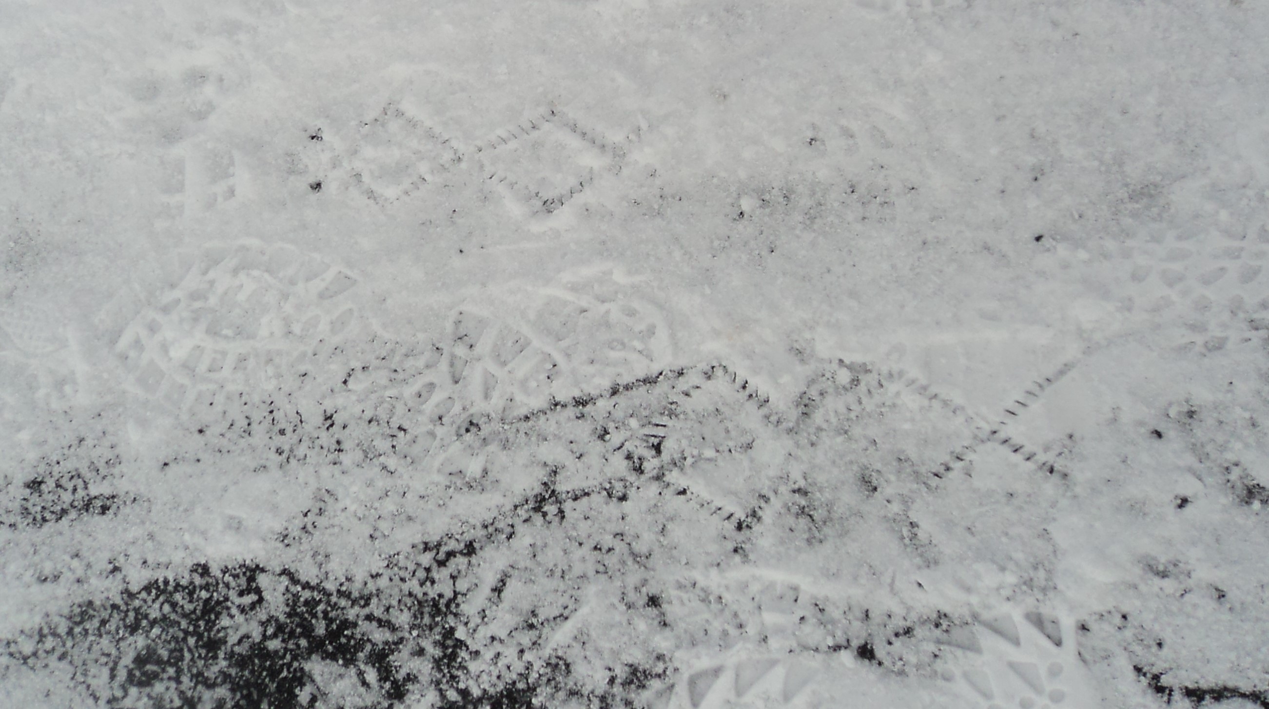 I got familiar at spotting the tracks of what one could use to help grip the ice – particularly the crisscrossing marks left by Yaktrax brand ice-traction devices people add to their shoes.