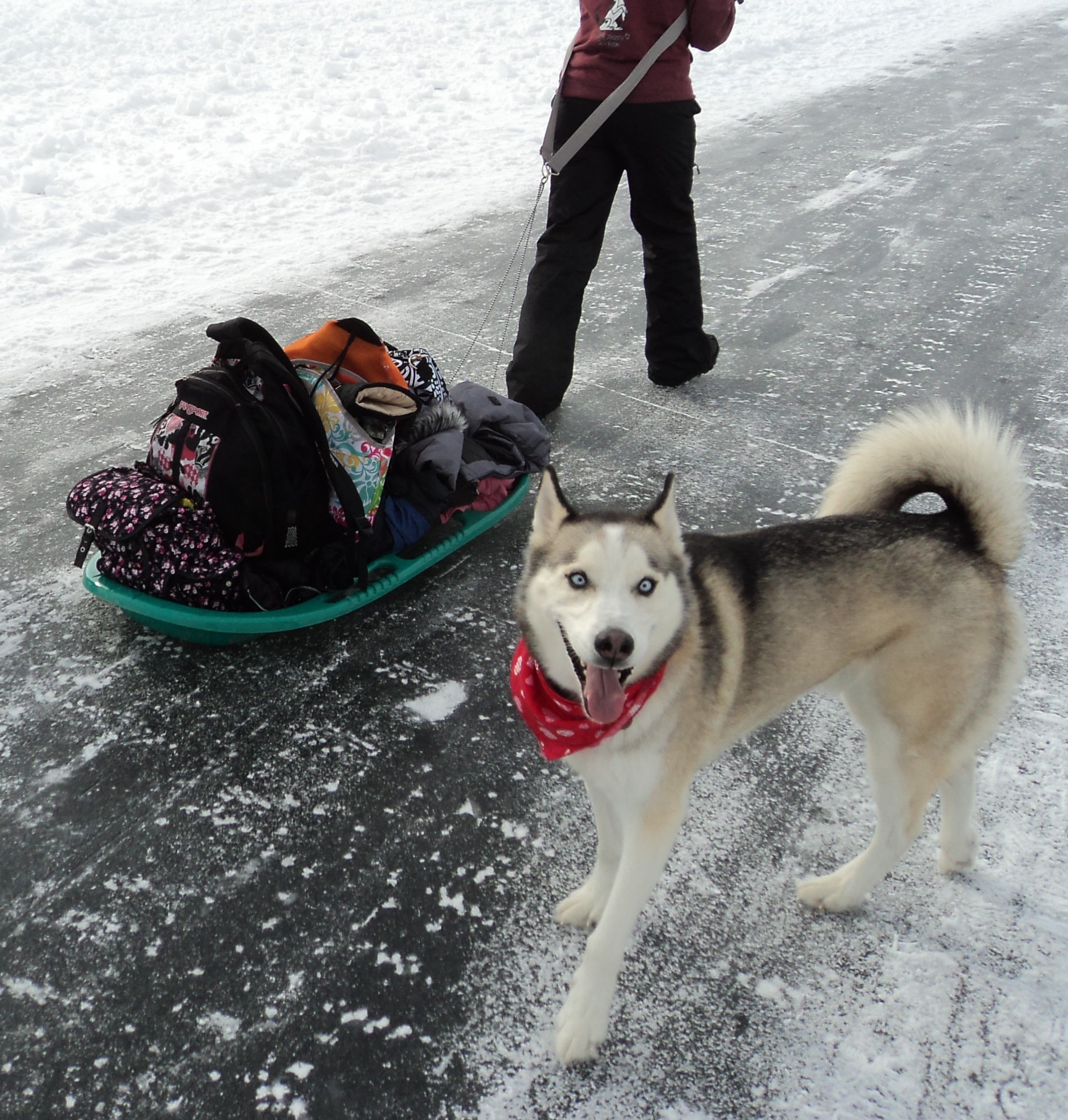 Serendipitously, a dog charmingly posed amidst the shot I was setting up of the sled! This event raises funds for the Neenah Animal Shelter, so there are a lot of dog-lovers on the walk – but not a lot of dogs, given the difficult conditions. (And yes, on this winter landscape, the dogs get to walk, while humans do the hauling πŸ˜‰