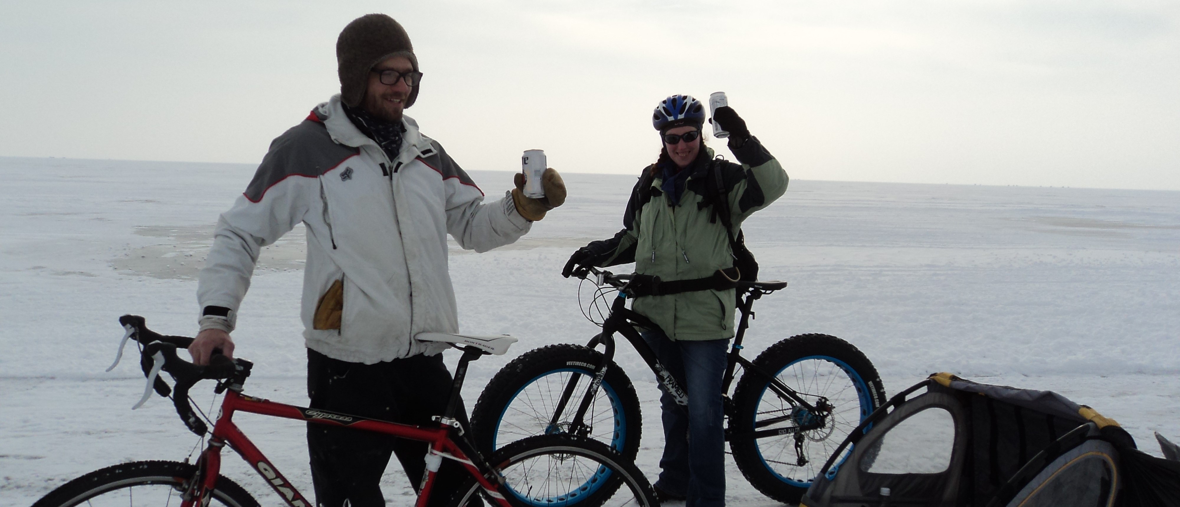 At Apple Pie Ville, the supplies are brought by truck, but others find different ways to haul items. On the left, we see an example of a rare but regular practice – pulling a sled’s worth of supplies across the ice. On the right, a bike used to pull a supply sled, by bikers spreading good cheer on their way across the ice!