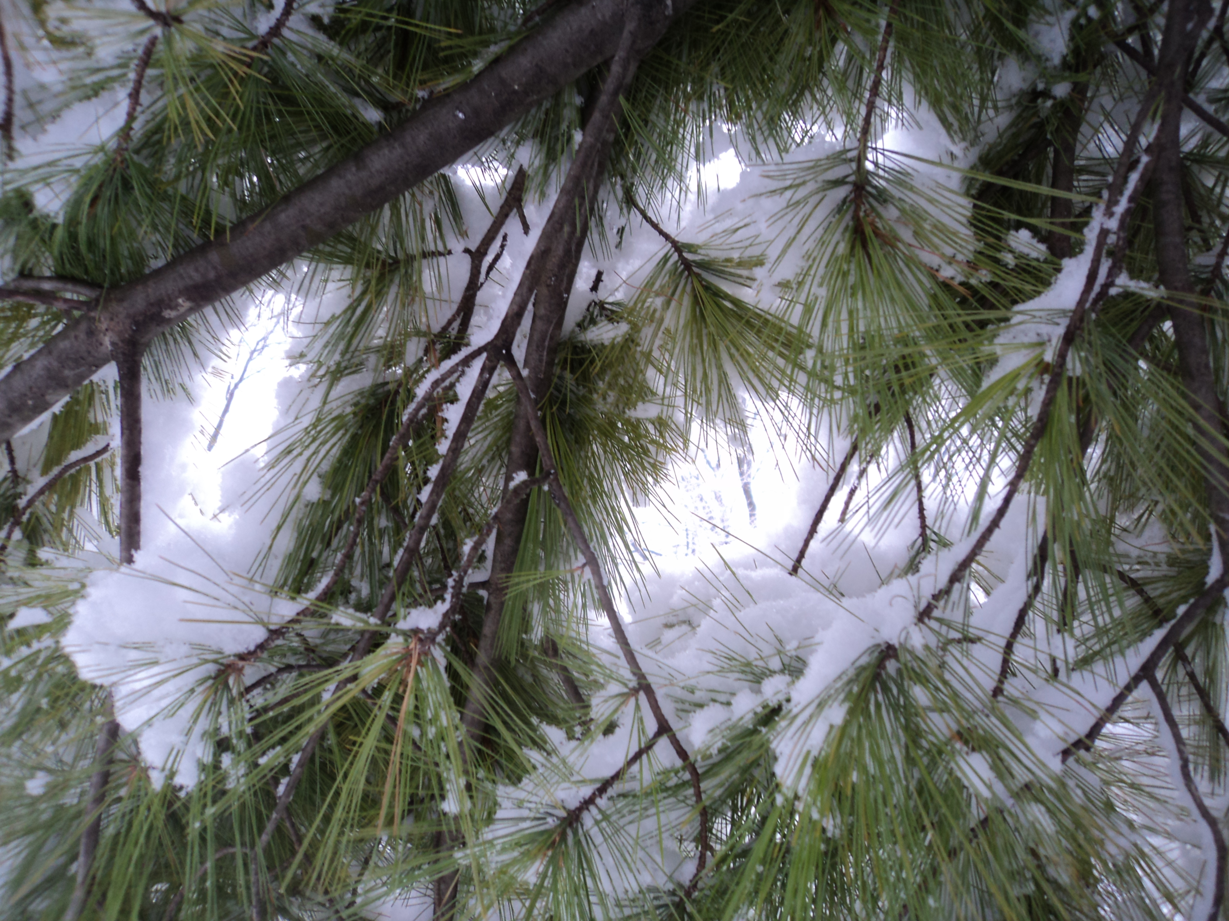 How does snow sit in different trees? To explore this question, it helps to head out during, or shortly after, a snow which clings to branches. Snow does not tend to stay long in trees. But while it is there, one can keep an eye on how certain branches get coated (sometimes with ice as well), and what effect a skeletal structure now white rather than brown has; how thorough the coating is, how much the sun brightens in, and more. On trees which keep leaves or needles, how can snow pile up in bunches on it? How does each branch have a slightly different set of details in its balance of how snow hangs from it, extends it, coats it? How do – particularly if one looks from underneath – green and brown still project themselves, leading to striking complements between the colors.